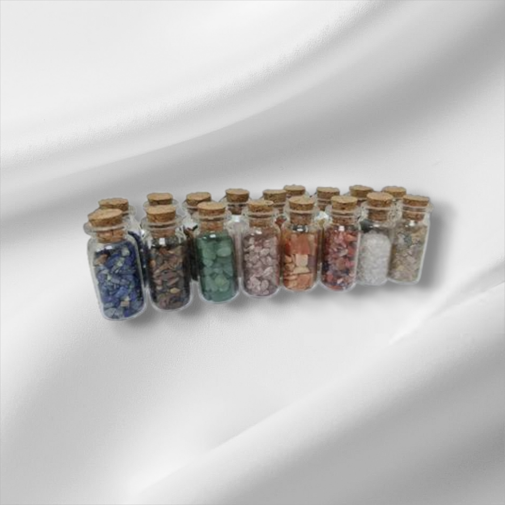 Las botellitas de cristal contienen pequeños minerales, ideales para coleccionar.