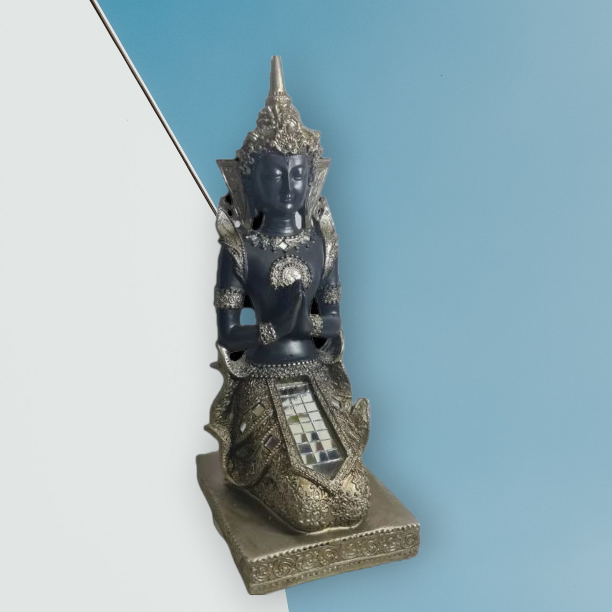 La figura de Buda Thai, con unas dimensiones de 28 cm y un peso de 545 gr, se presenta como un símbolo inspirador que evoca pensamientos de abundancia, armonía y serenidad.