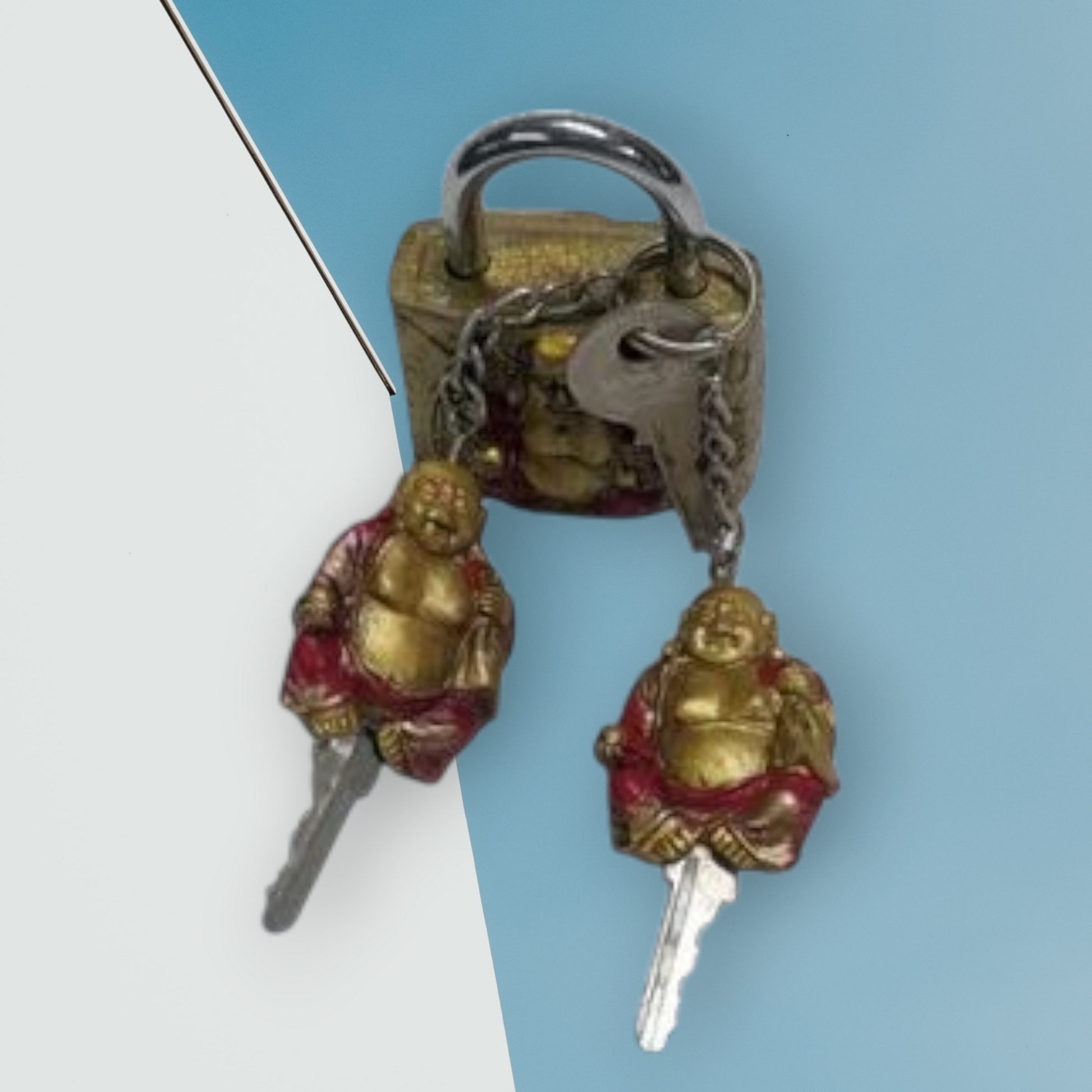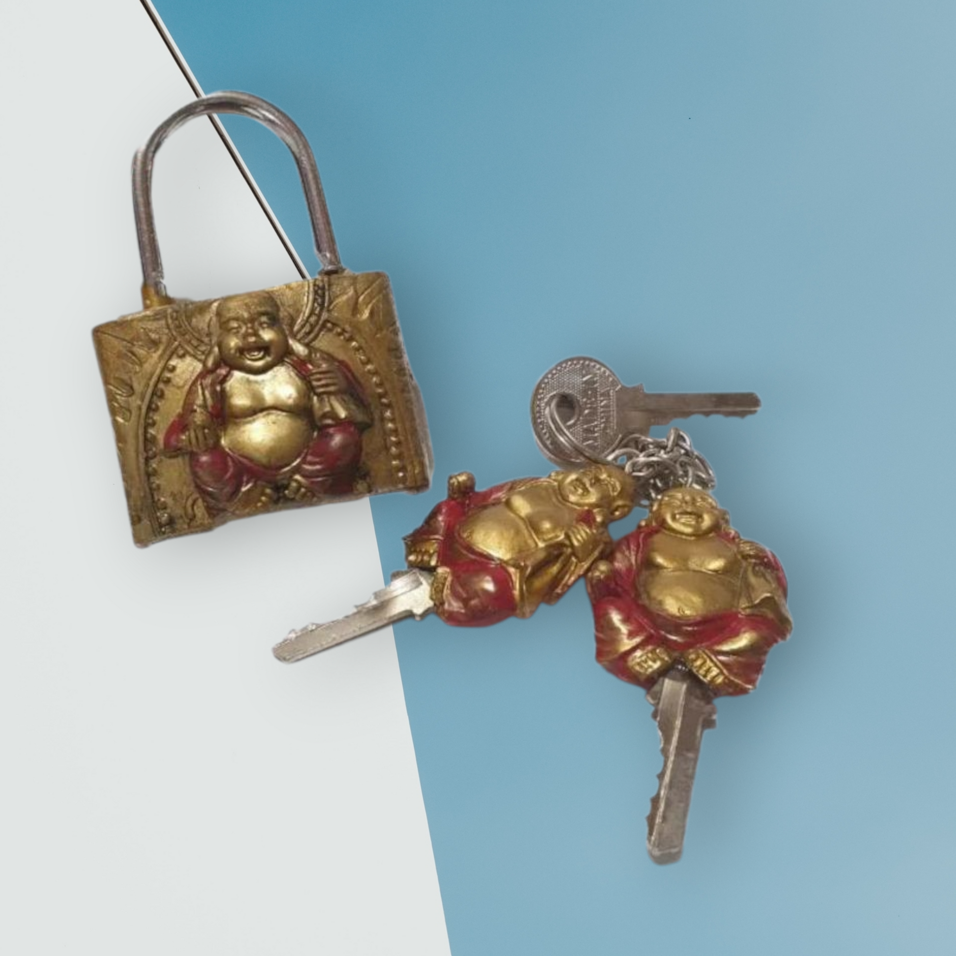 Un amuleto que combina funcionalidad y simbolismo, el candado Buda Hotei es un objeto de metal con dimensiones de 6 cm de largo, 4 cm de ancho y 1 cm de grosor, y un peso de 141 gramos.