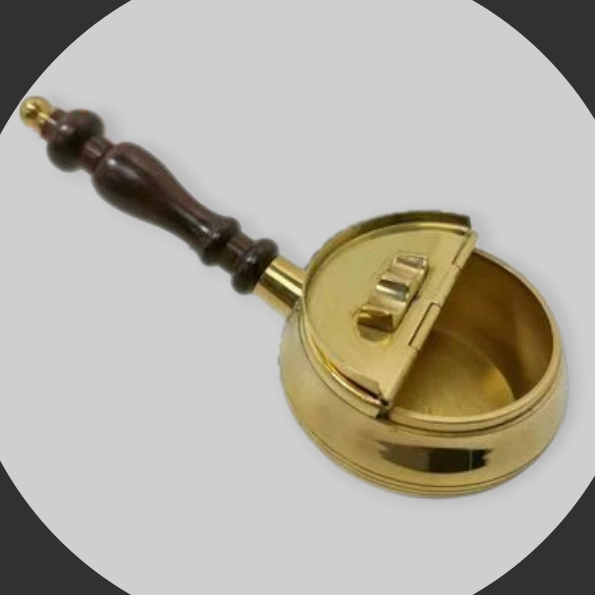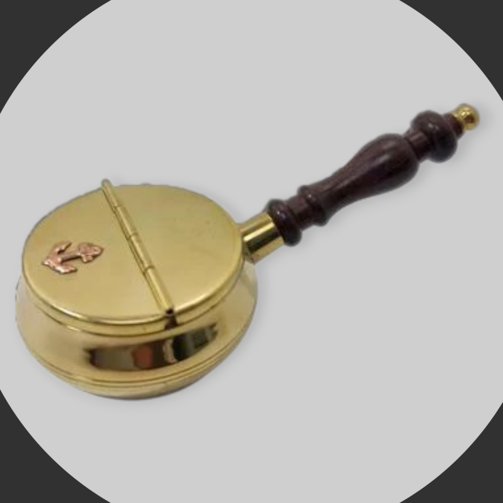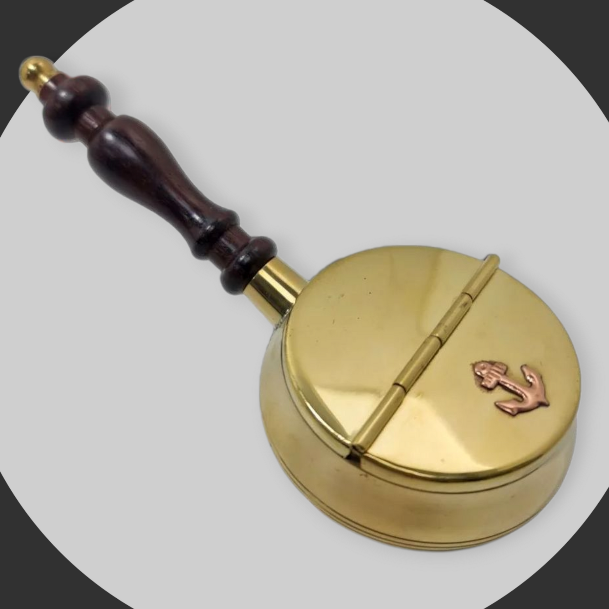 El "Cenicero con Mango" es una pieza única de DECORACION MISTICA que combina bronce con mango de madera y un diseño de ancla.