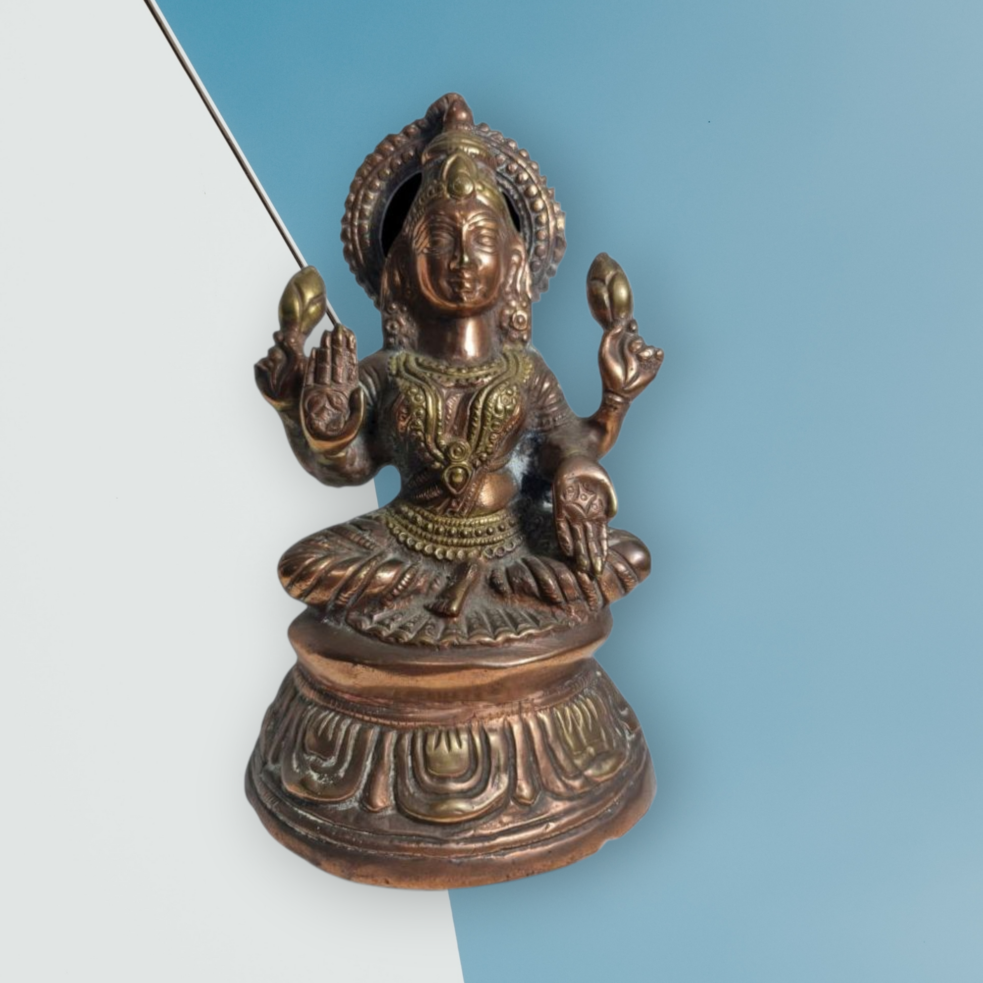 La figura de Lakshmi, elaborada en latón, tiene un peso de 1425 gramos y dimensiones de 20 cm.