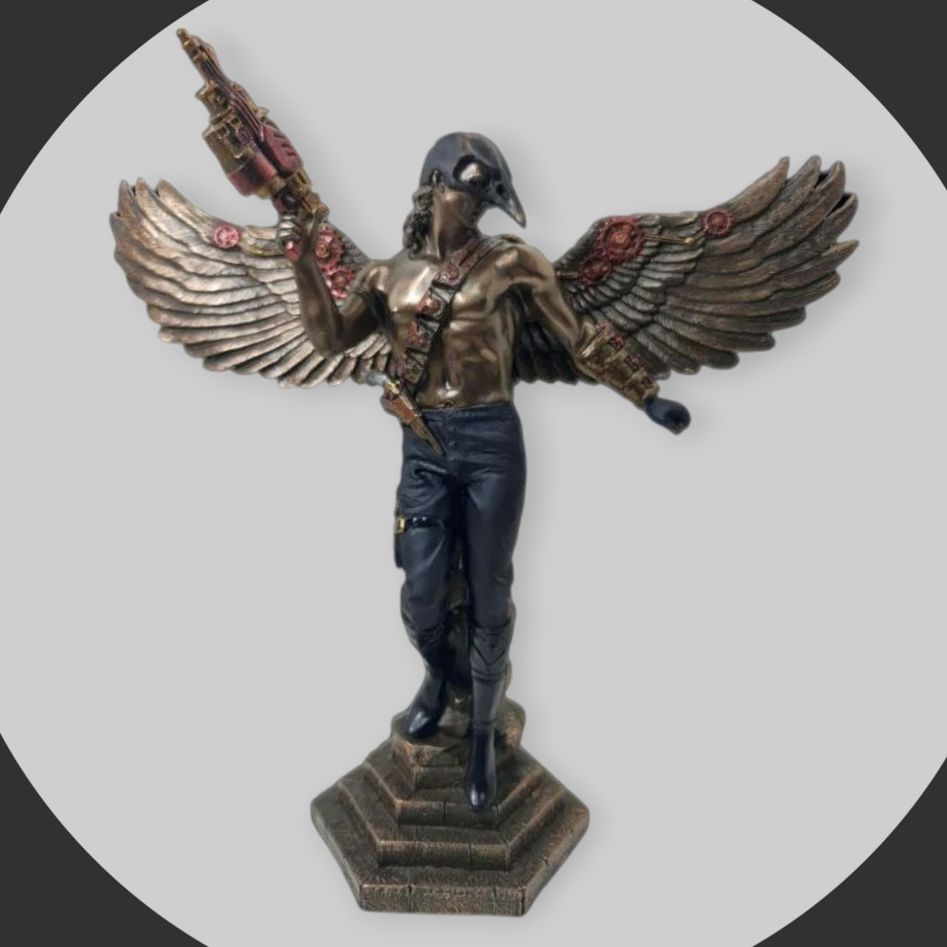 La escultura del guerrero steampunk destaca por su diseño único, que combina elementos de la estética steampunk con una figura masculina estilizada