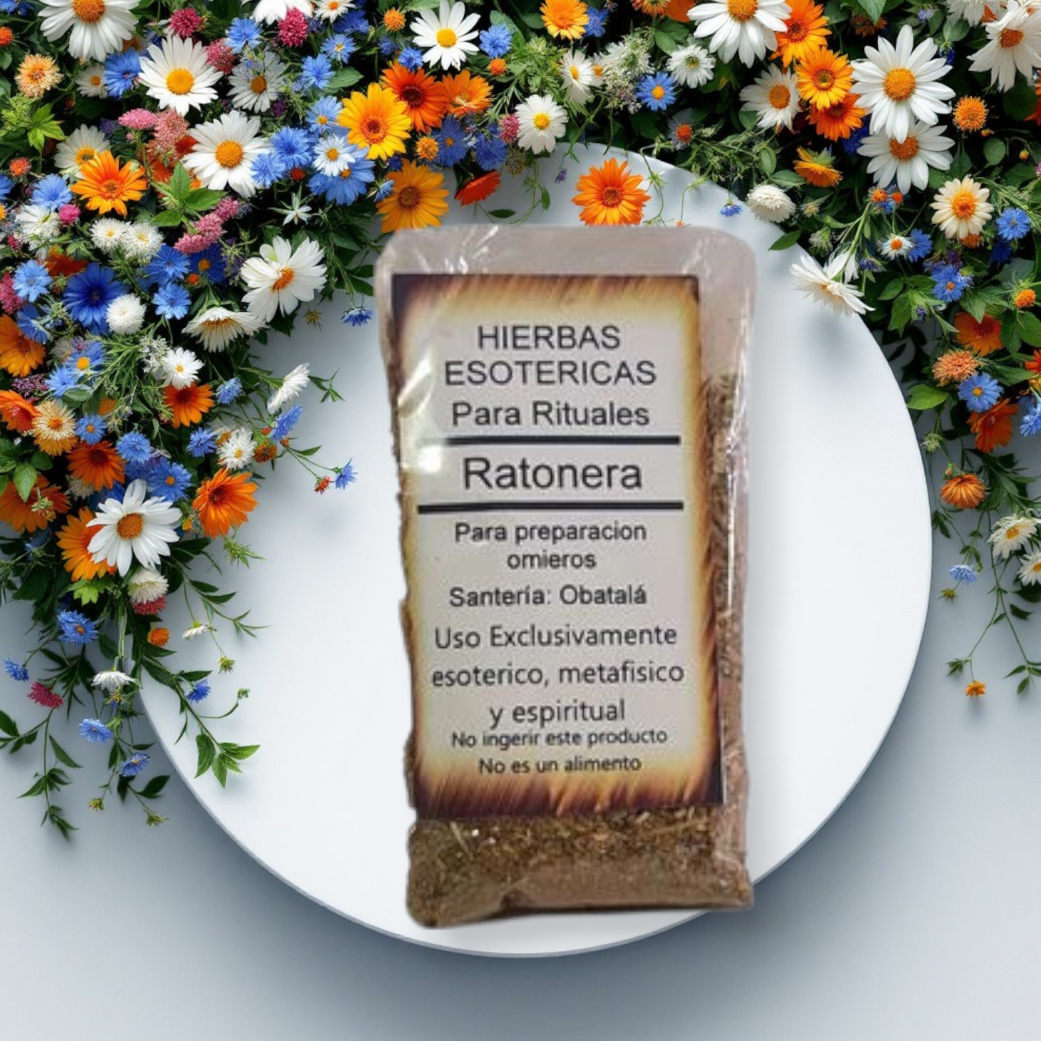 - Ratonera se utiliza esta hierba en la prepacion de omieros y en rogamiento de cabezas En Santeria pertenece a : Obatalá
