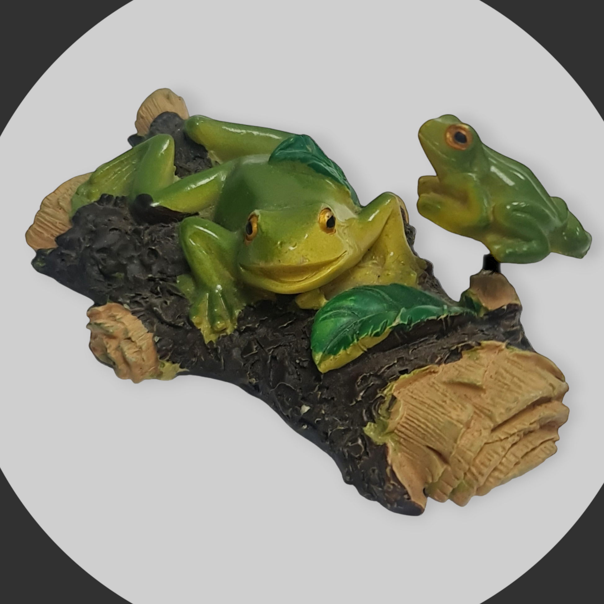 La "Iman Rana" con ranita bebé en un tronco es una pieza mística de decoración que captura la esencia de la naturaleza.