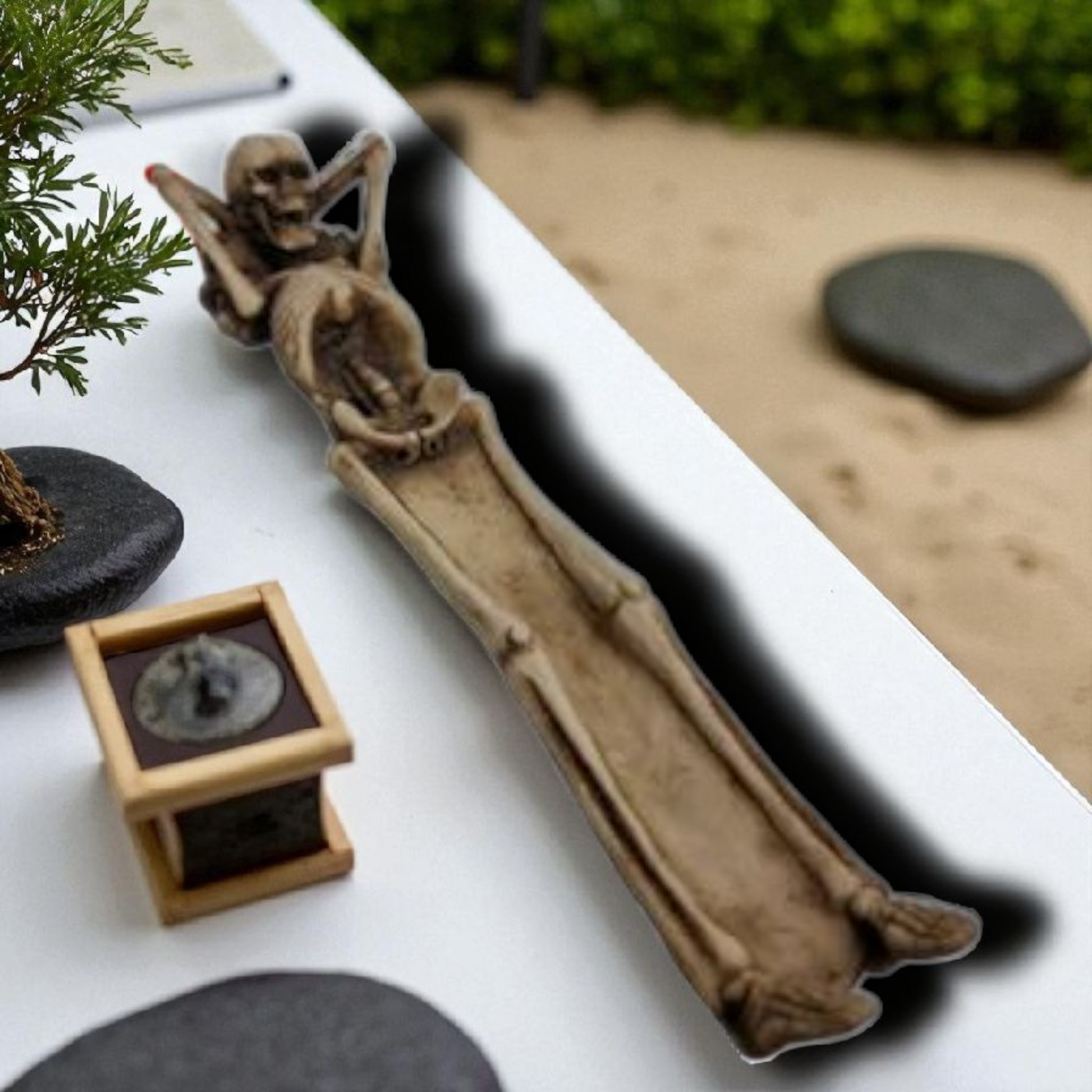 El incensario esqueleto, con un tamaño de 27 cm y un peso de 177 g, está fabricado en resina, lo que le confiere durabilidad y un diseño distintivo.