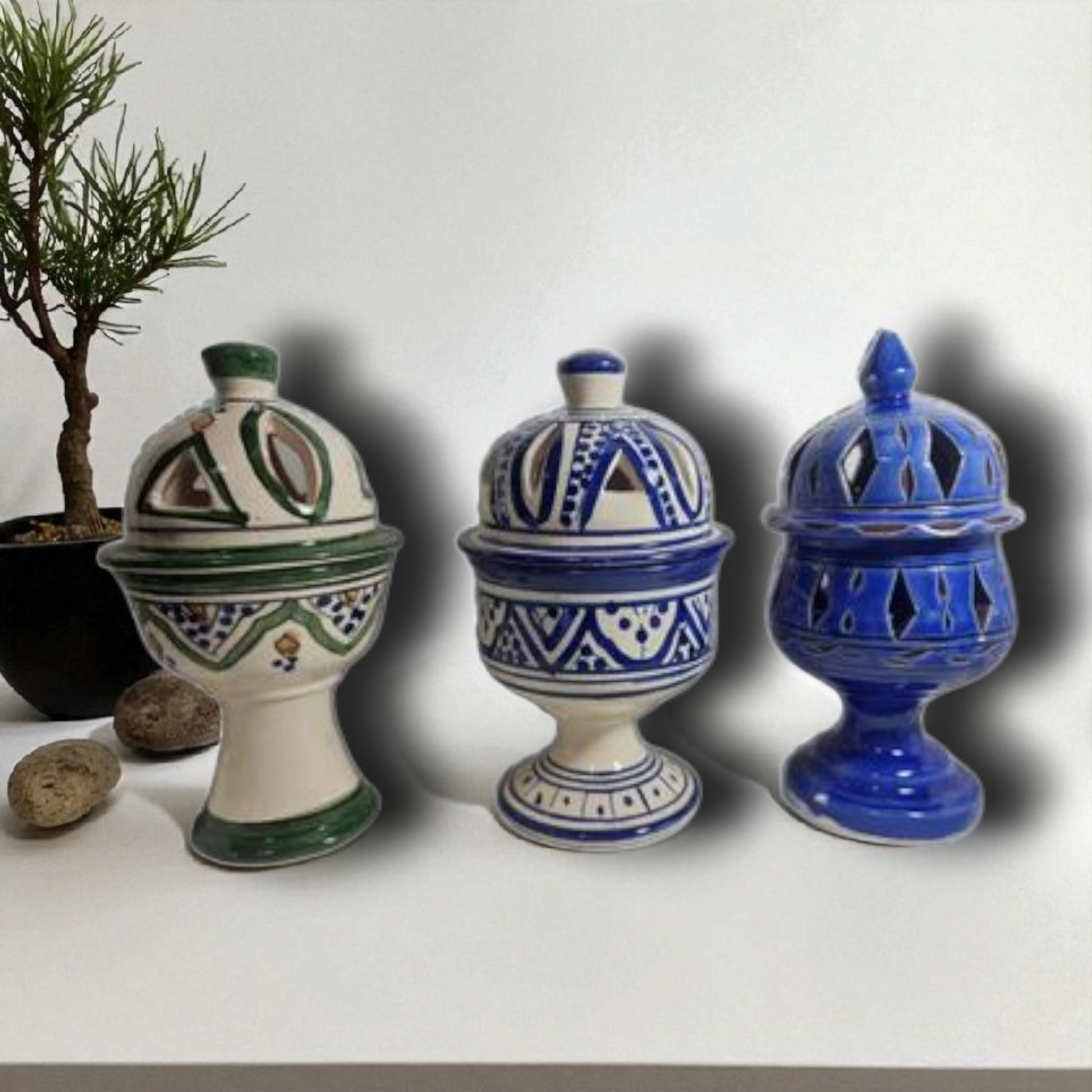 Este incensario quemador de cerámica esmaltada de 22cm, elaborado a mano en Marruecos, es perfecto para crear una atmósfera relajante y aromática en tu hogar.