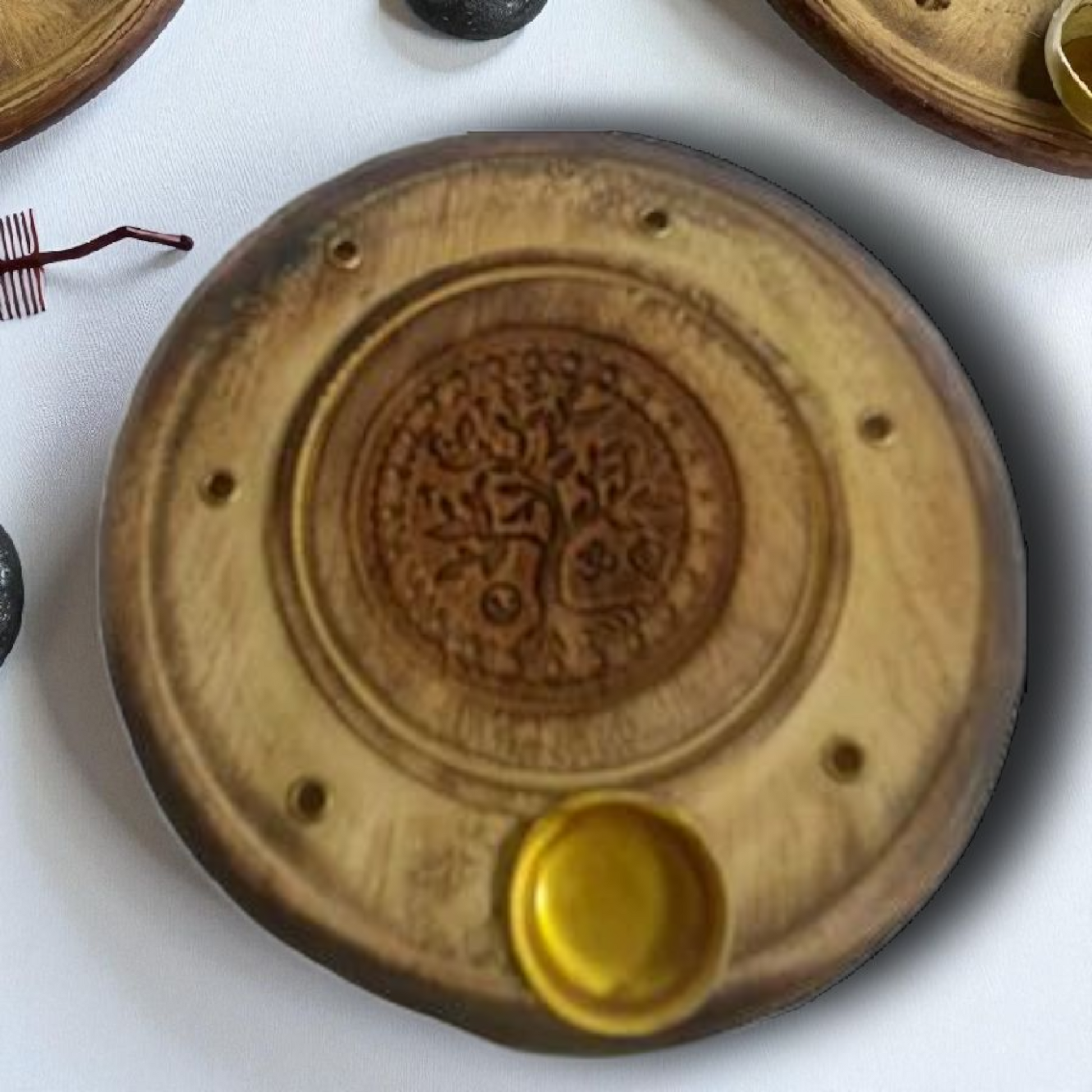 El incensario de madera grabado, con un tamaño de 10 cm, es un recipiente ideal para el sahumerio de materias aromáticas como el incienso.