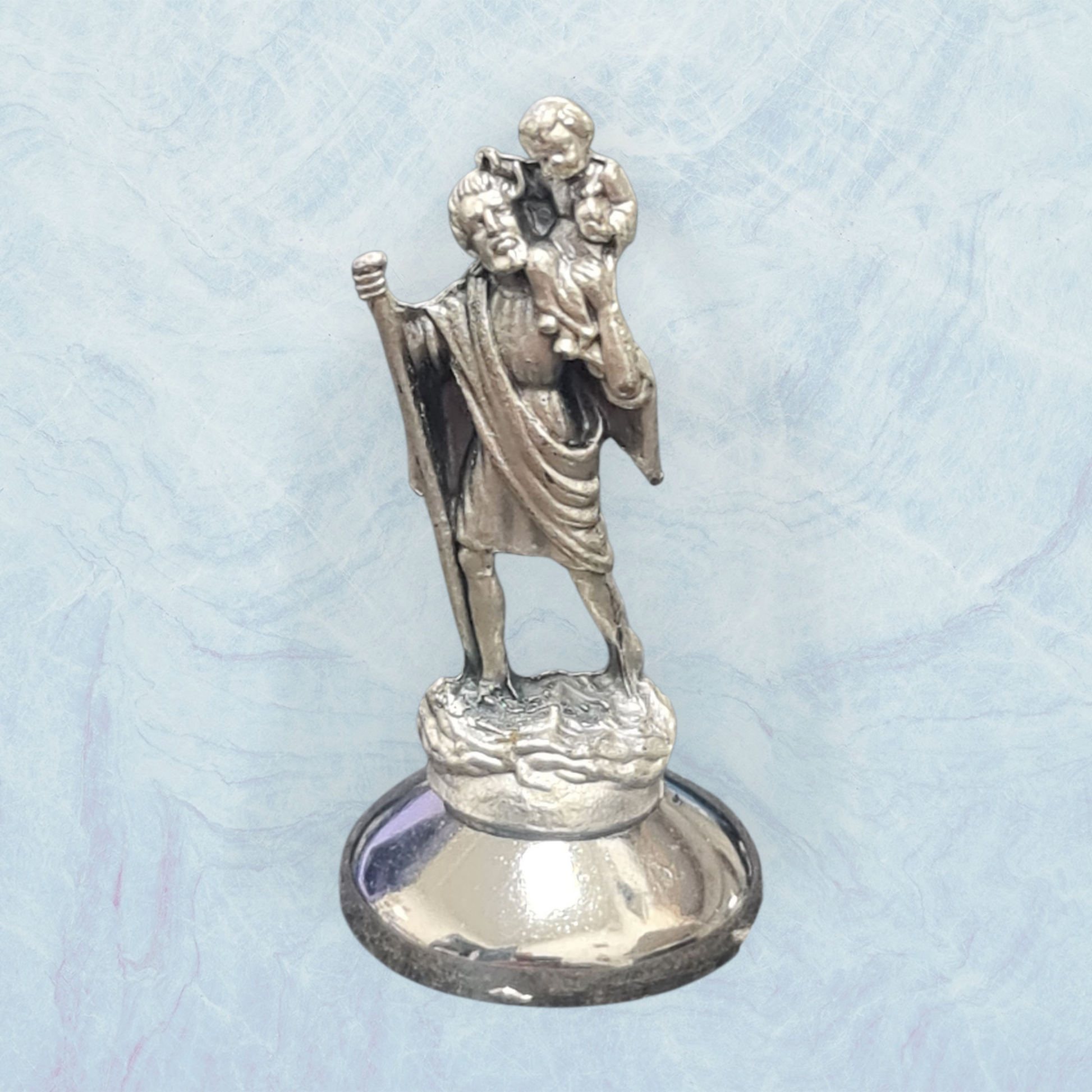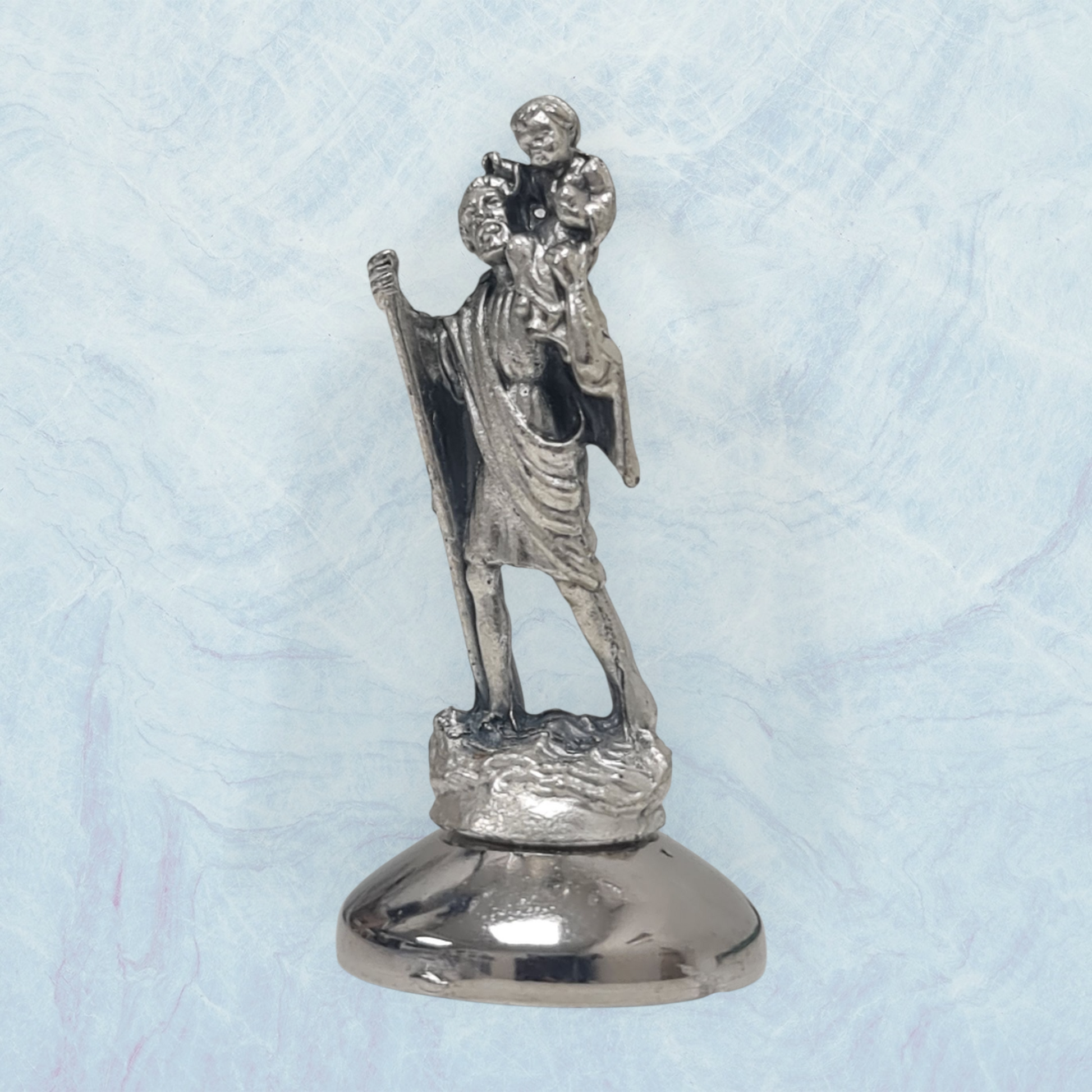 Fabricado en metal resistente, este resguardo para coches del santo de los conductores San Cristóbal , cuenta con una altura de 5 cm.
