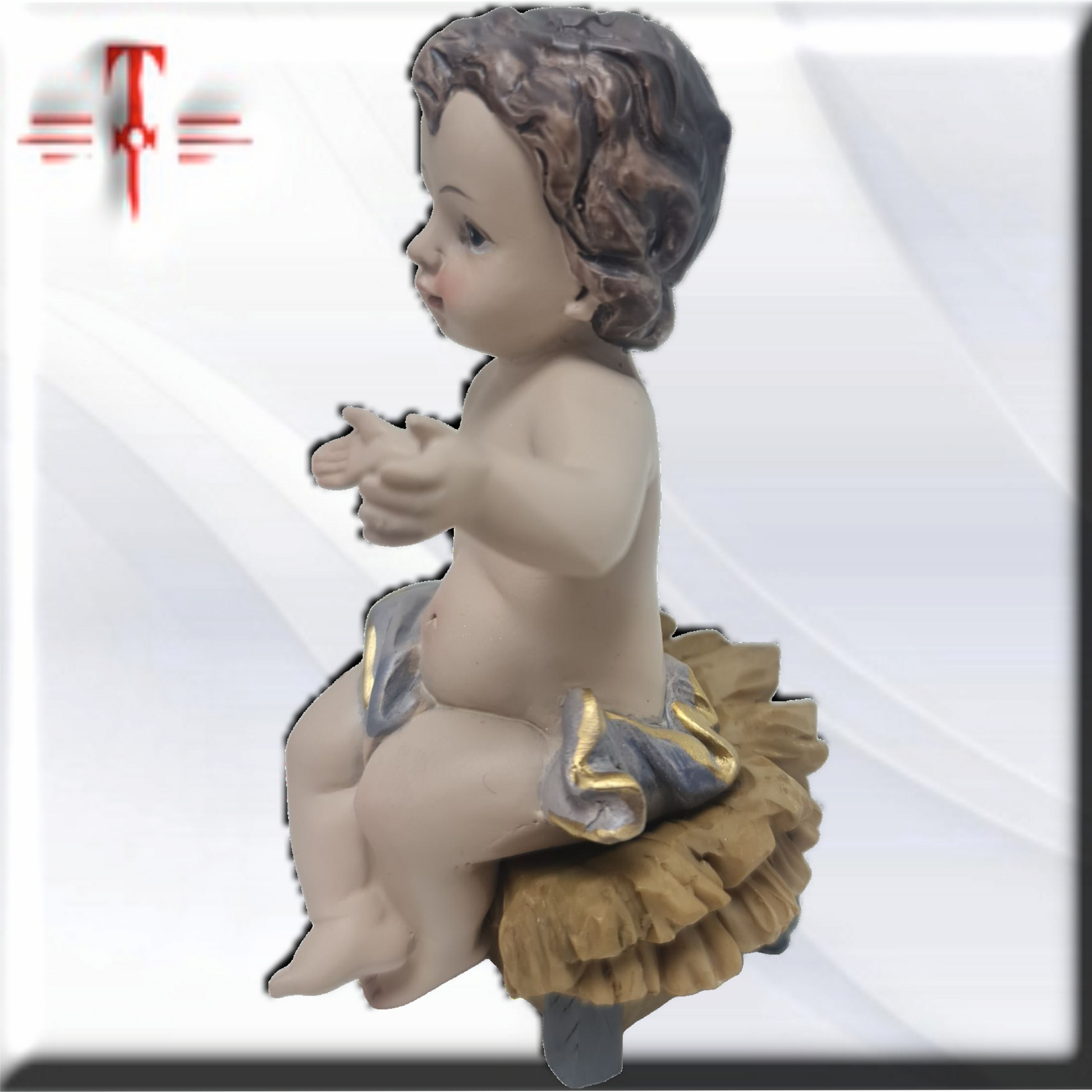 Una figura de Niño Jesús sentado, elaborada en resina de alta calidad, pintada artesanalmente para un acabado único.