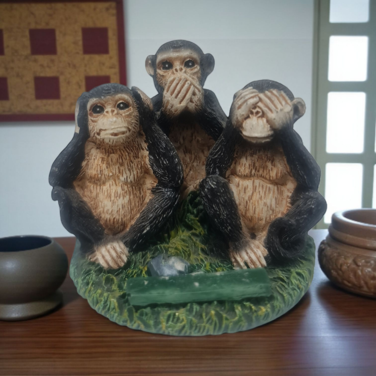 El producto "3 monos ver, oir, callar" de SPOTENCIAS es una figurita de 5 cm de resina que representa los tres monos sabios: uno tapándose los ojos, otro los oídos y el tercero la boca.