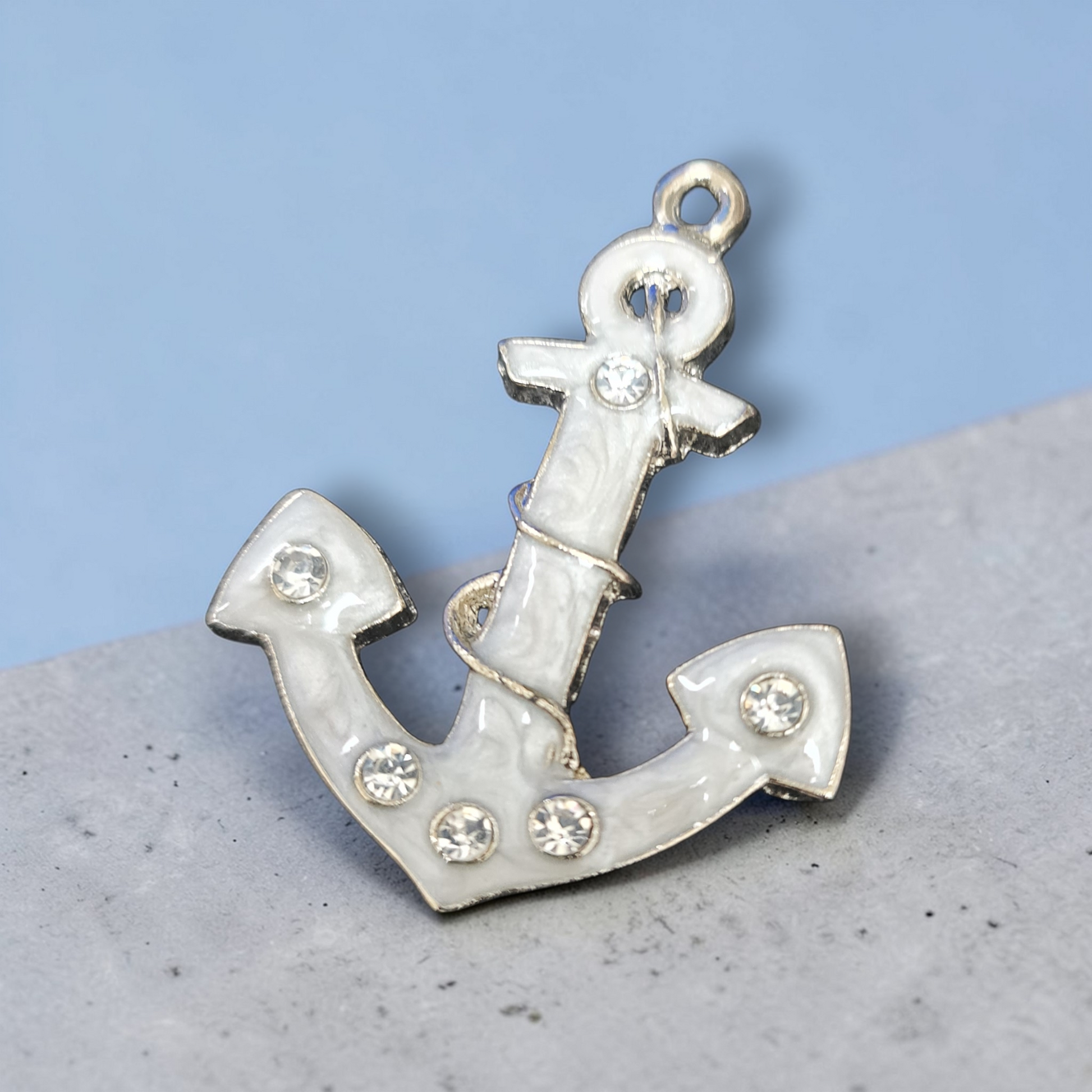 Con un tamaño de 5 cm y un peso de 20 gr, este ancla de metal está diseñada con una capa de nácar y brillantes, lo que le otorga un aspecto distintivo.