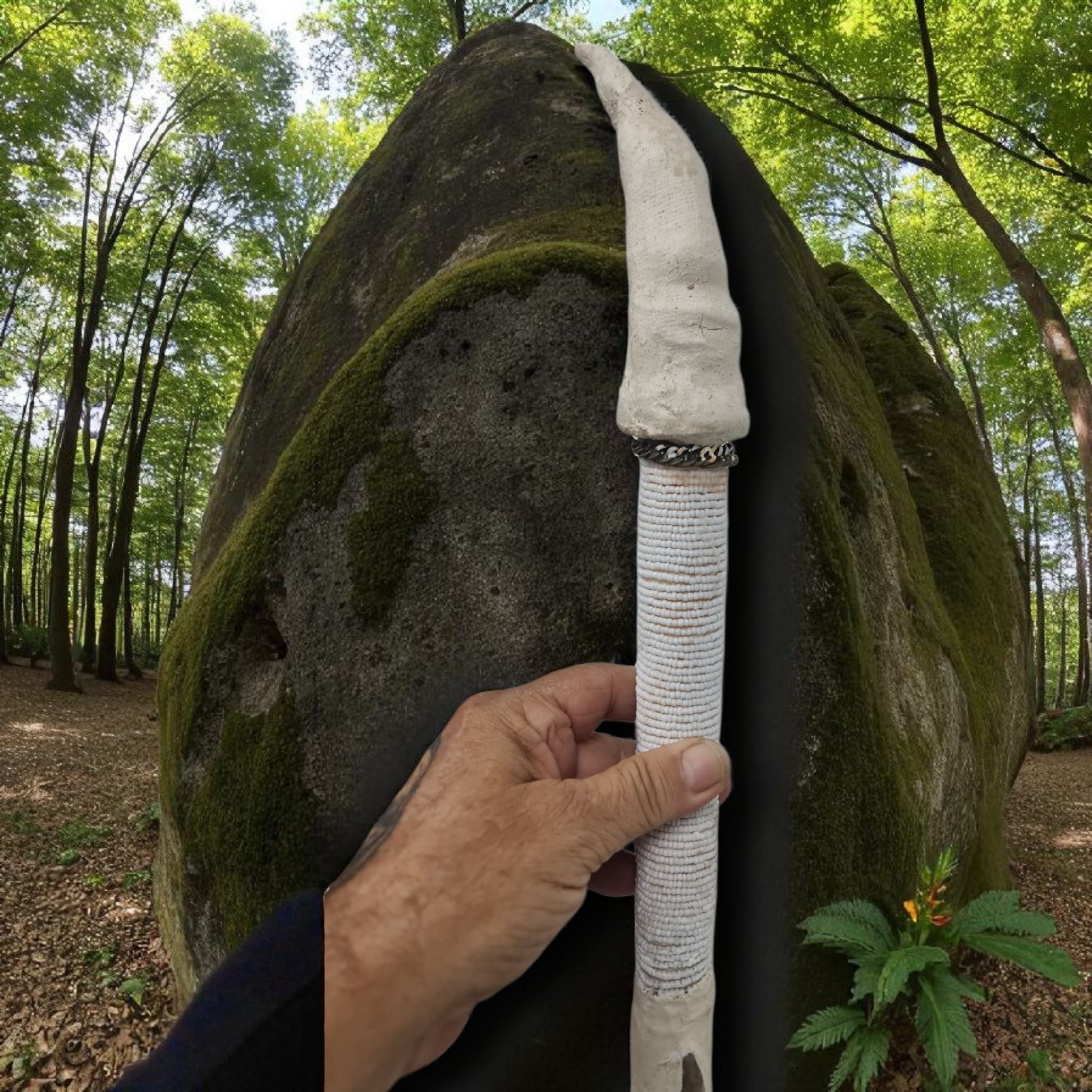 Este bastón incorpora semillas africanas y está relacionado con prácticas de santería, Palo Mayombe y voodoo, lo que lo convierte en un objeto de interés cultural y espiritual.