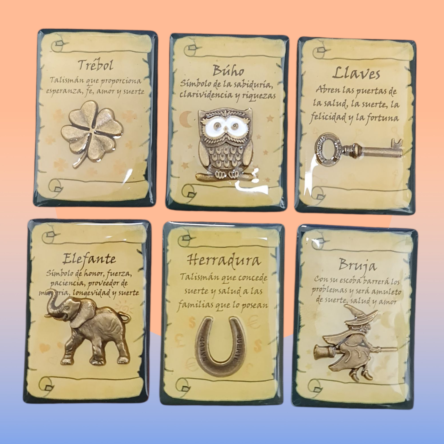 Carteles magnéticos de 7x5 cm con símbolos de la suerte, ideales para regalos y detalles.