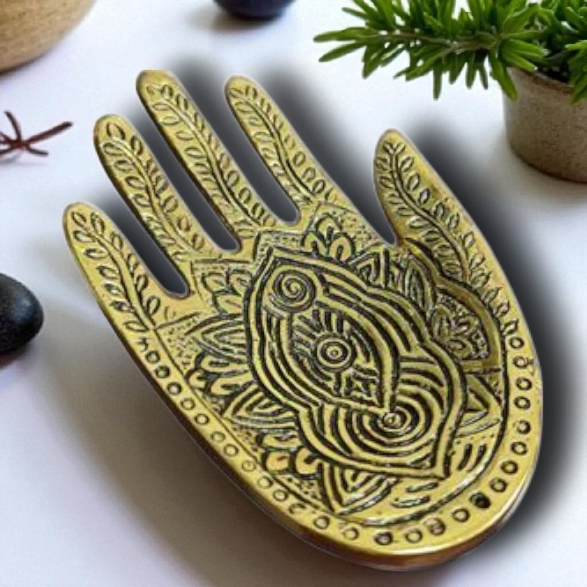 El incensario de metal mano es una pieza única con forma tallada y 13cm de largo que añadirá un toque especial a tu espacio.