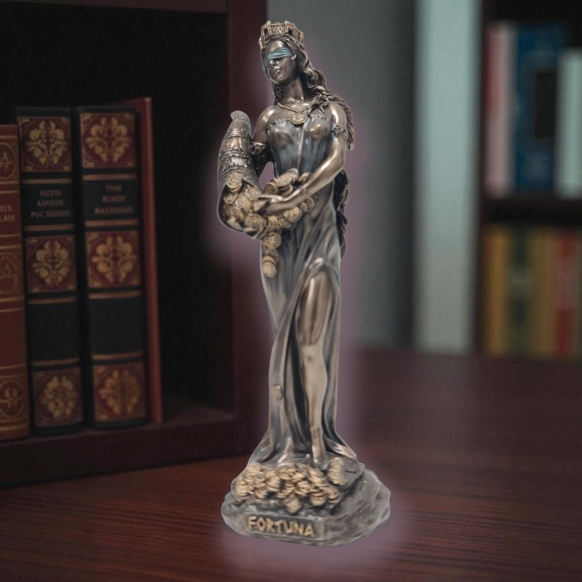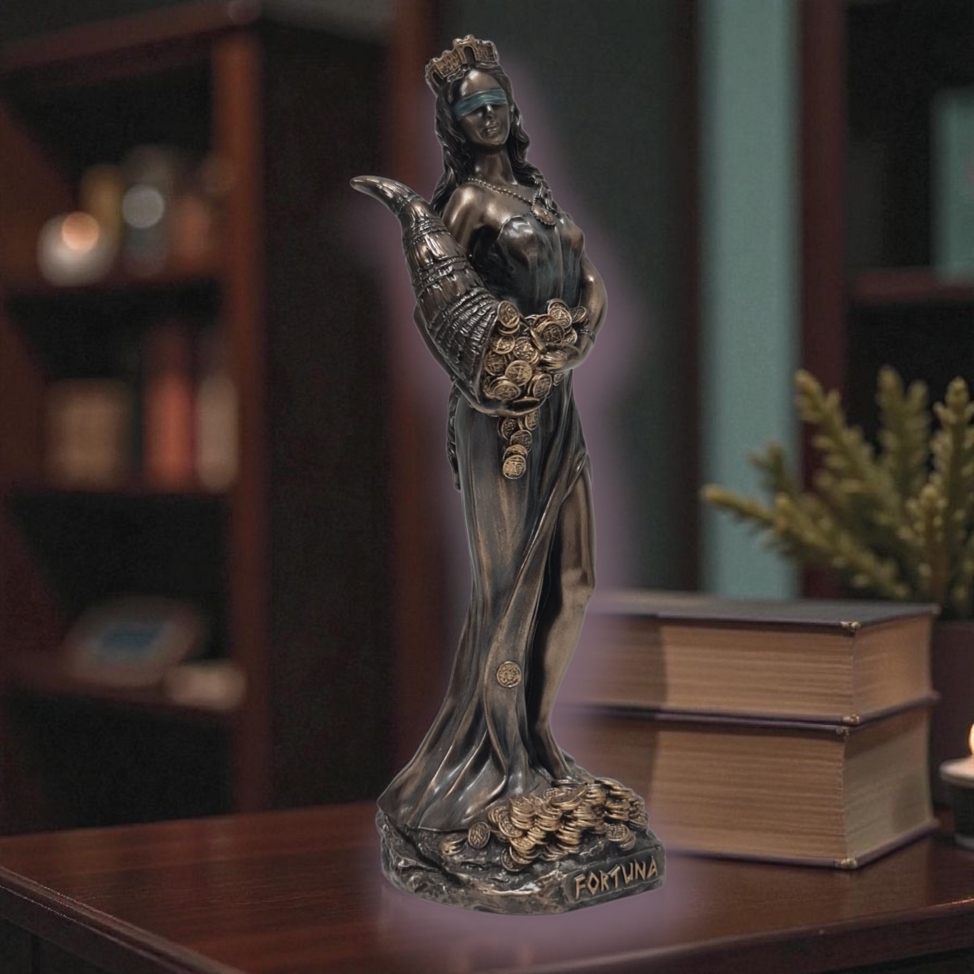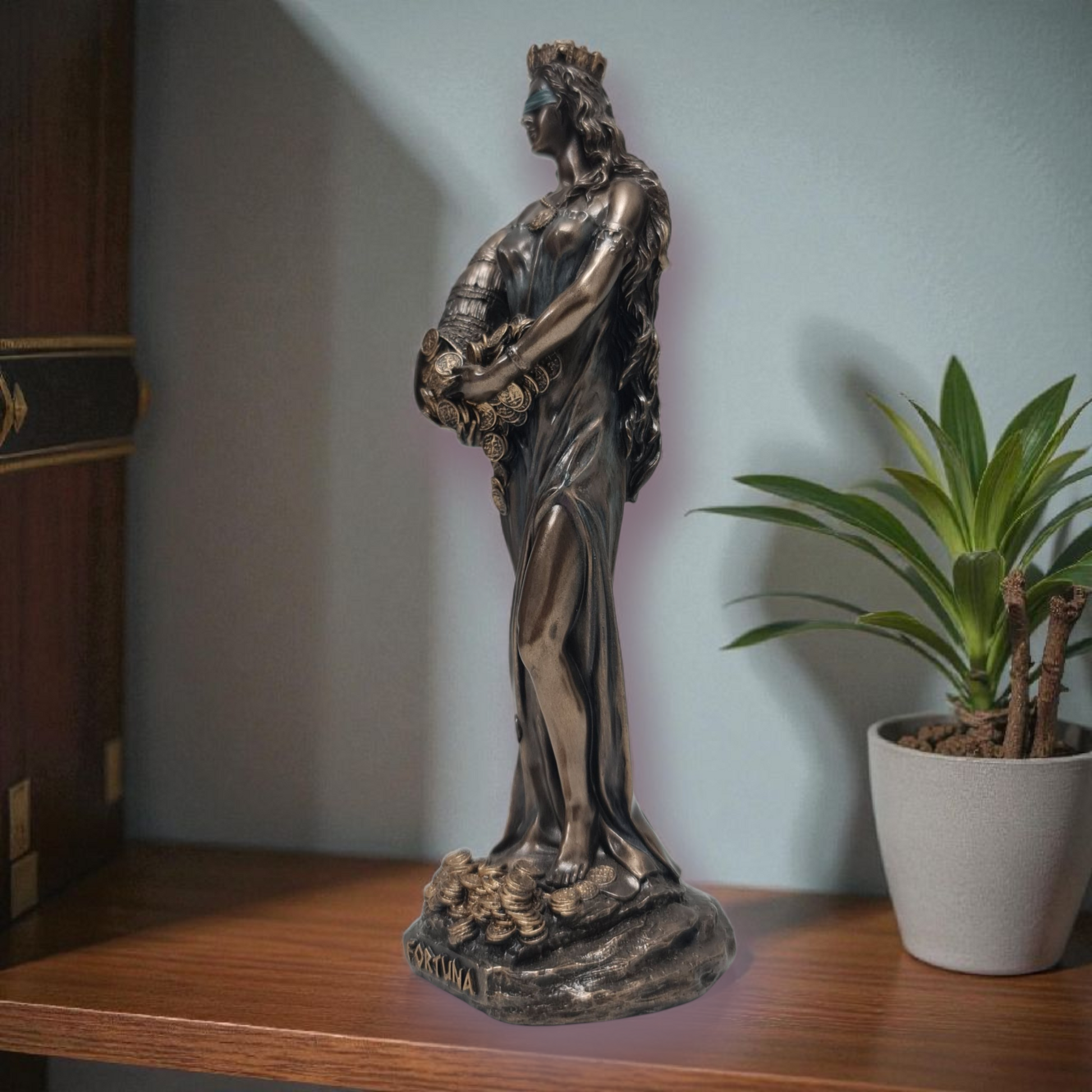 La figura de la diosa de la fortuna está elaborada en resina, destacando su estilo veronese que aporta un toque de elegancia a cualquier espacio.