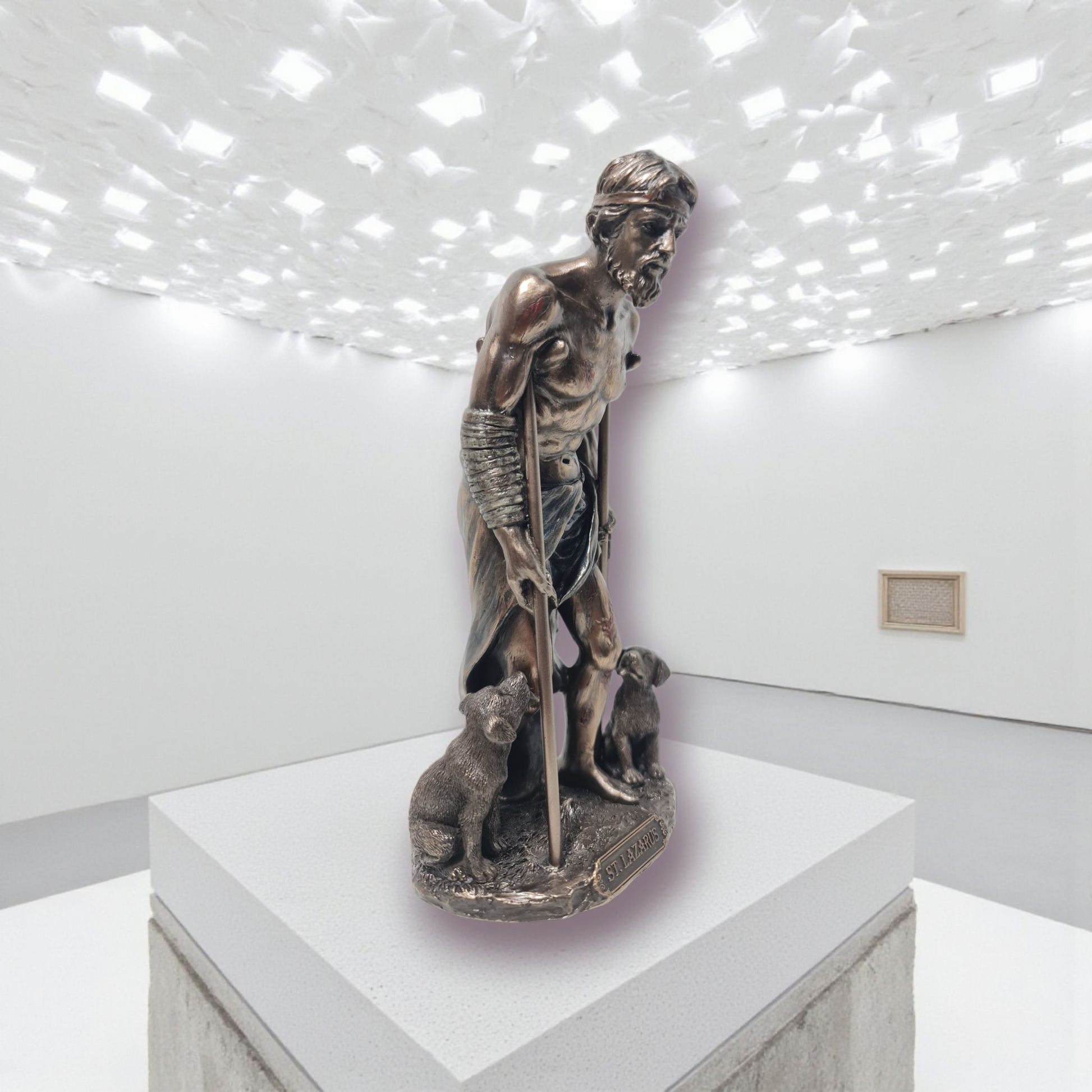La figura de San Lázaro, elaborada en resina con un peso de 480 gramos y dimensiones de 20 cm, representa dos personajes emblemáticos: